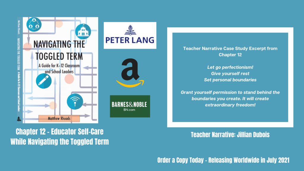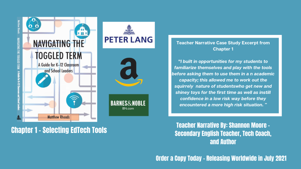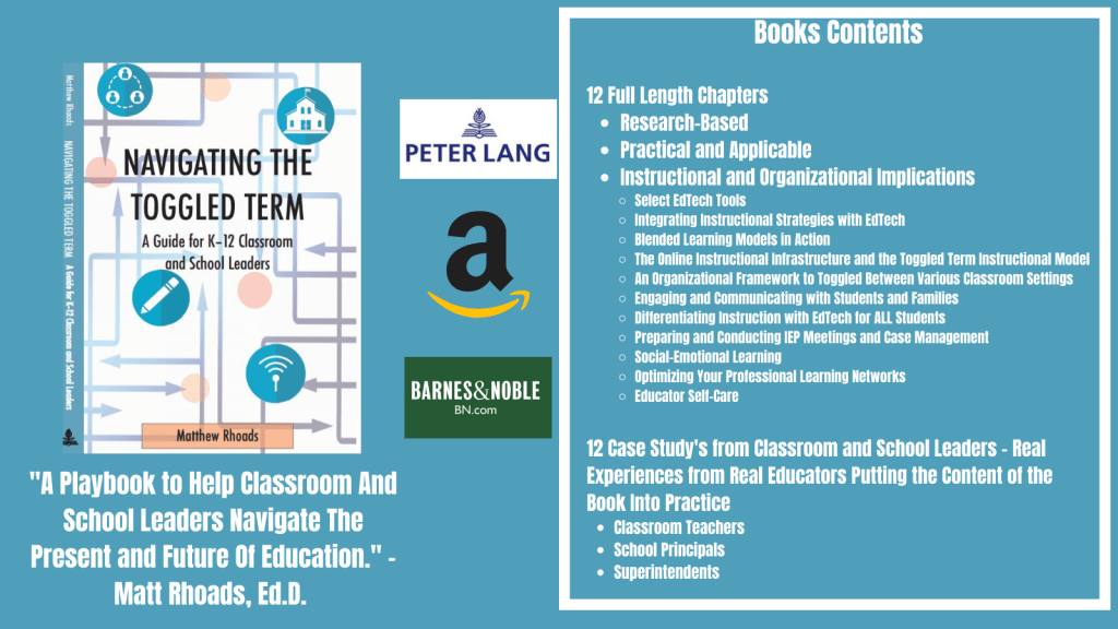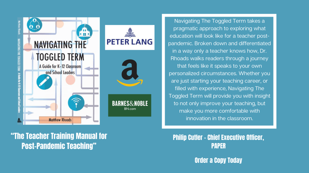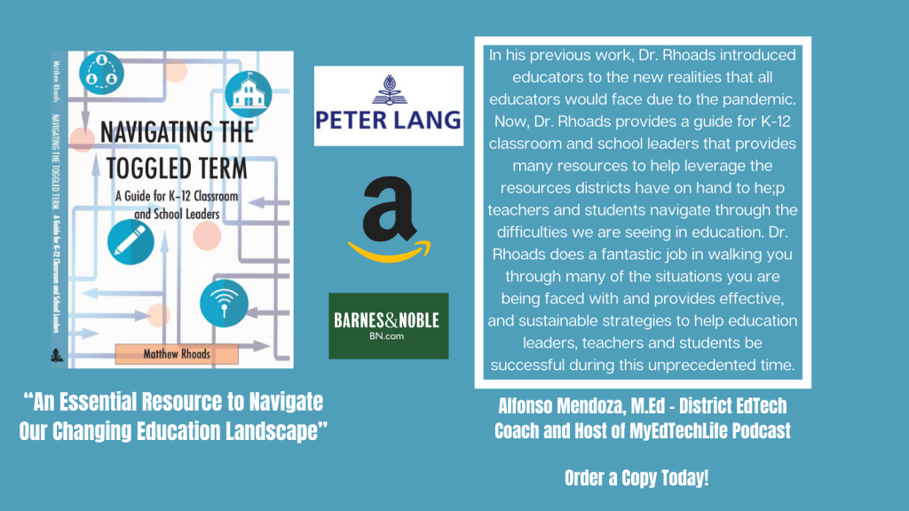 Today is the day for the worldwide release of Navigating the Toggled Term: A Guide for K-12 Classroom and School Leaders. Writing this book was a labor of love with the goal of impacting teachers, school leaders, and most importantly, our students as we navigate the present and future of education during this challenging time. Overall, this book provides a playbook to how to navigate online, blended, and traditional in-person classroom settings as well as toggling between each instantaneously, integrating research-based instructional strategies with EdTech tools to amplify student learning, and a variety of other topics ranging from differentiating instruction, Special Education, communicating with the students and families, and educator self-care.