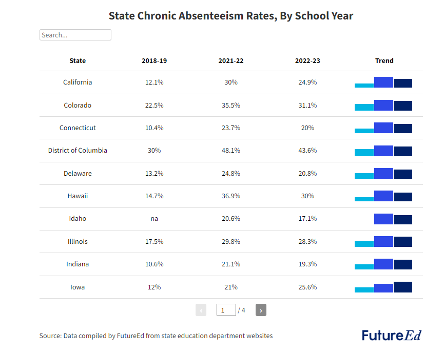 Besides a fall in PISA scores worldwide, in the US we see an increase in chronic absenteeism and disengagement by students. Chronic absenteeism is nothing new, but it has only gotten worse over the last five years. Other variables (such as the pandemic) can be placed into this equation, but I argue smartphones and the use of smartphone parenting by parents can be associated with this increase in absenteeism and disengagement in school. Below is a study conducted by Future Ed where we see only modest improvements in absenteeism after the pandemic in 2023. If we look at the percentage of student absenteeism before the pandemic versus now, in many states we see an average of 10% higher rate of absenteeism. I hypothesize that with far more distractions and the inability of parents to moderate phone use, we see many students withdrawing and avoiding school.