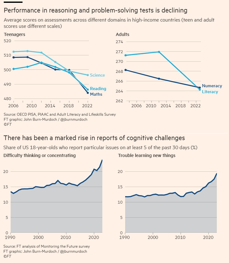 My concerns were recently amplified after stumbling upon a thought-provoking piece on “The Average College Student Today” on Substack and an equally unsettling article in the Financial Times by John Burn-Murdoch titled, “Have humans passed peak brain power?” These readings, coupled with studies highlighting a cross-generational dip literacy, problem solving, and reasoning, and my own anecdotal experiences working with students over the past decade, have led me to a stark conclusion: we are potentially facing an existential crisis, one that demands our immediate and collective attention. This isn’t just an educational and learning issue; it’s a societal one that needs to be addressed within our schools and beyond.