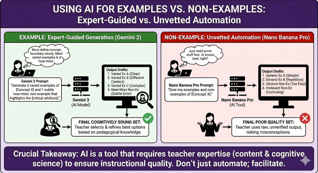 The rapid advancement of generative AI models (like Gemini 3 and Nano Banana Pro) offers unprecedented opportunities to create rich instructional materials, such as varied examples and non-examples, even in real-time. However, while AI can accelerate production, it cannot replace pedagogy. The effectiveness of these tools rests entirely on a teachers ability to evaluate outputs through two critical lenses: deep domain content knowledge to ensure mathematical or factual accuracy (with this example), and a strong grasp of cognitive science to ensure instructional soundness. Teachers must know why a specific non-example is necessary to define a concept’s boundary to prompt the AI effectively and vet its generation. Without this foundation in evidence-based practice, we risk flooding classrooms with materials that are visually compelling but cognitively ineffective.