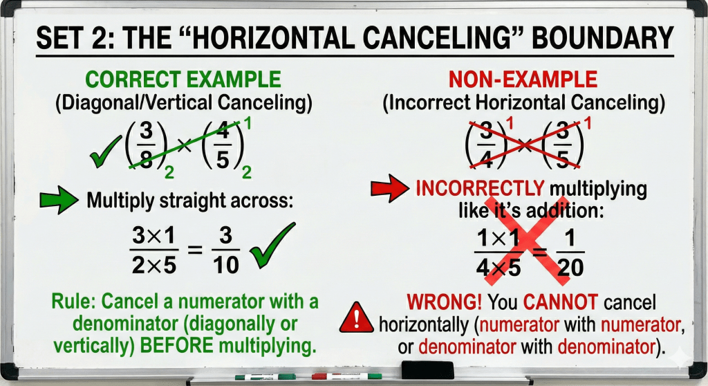 The second example vs. non-example focuses on the misconception that numbers can be canceled horizontally. It correctly shows diagonal canceling on the left and explicitly marks horizontal canceling as incorrect on the right, reinforcing the rule that canceling must be between a numerator and a denominator.