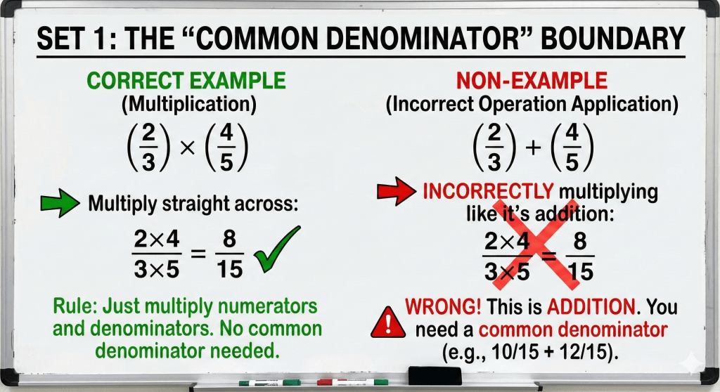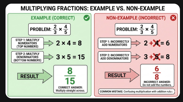 The third example vs. non- example targets the confusion between multiplication and division procedures. It contrasts a standard multiplication problem with a non-example where the student incorrectly applies the “flip” rule (reciprocal) that is used for division.