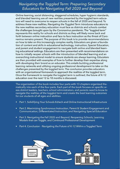 Online learning, social distancing, staggered schedules, hyper hygienic standards, and blended learning are all new realities presented by the toggled term educators will need to overcome to reopen schools in the fall of 2020 and beyond. To address these new realities, Navigating the Toggled Term introduces educators to the new realities secondary education must face as districts and schools combat the challenges brought upon by the Coronavirus pandemic. The “toggled term” represents this reality for schools and districts as they will likely move back and forth between online instruction and face to face instruction as the threat of Coronavirus remains present. The purpose of this book is to provide recommendations on how to take on this increasingly complex reality. Educators are given a foundation of content and skills in educational technology, instruction, Special Education, and parent and student engagement to navigate both online and blended learning educational settings. Educators are then presented with recommendations on how to initially reopen schools with the introduction of blended learning and an overarching instructional model to ensure students are always learning. Educators are then provided with examples of how to further develop their expertise along with developing their brand as an educator. This entails building professional learning networks and utilizing ongoing professional development to take on the challenges presented by the toggled term. The conclusion provides educators with an organizational framework to approach the realities of the toggled term. Once the framework to navigate the toggled term is outlined, the future of K-12 education over the next 12 to 18 months is discussed.